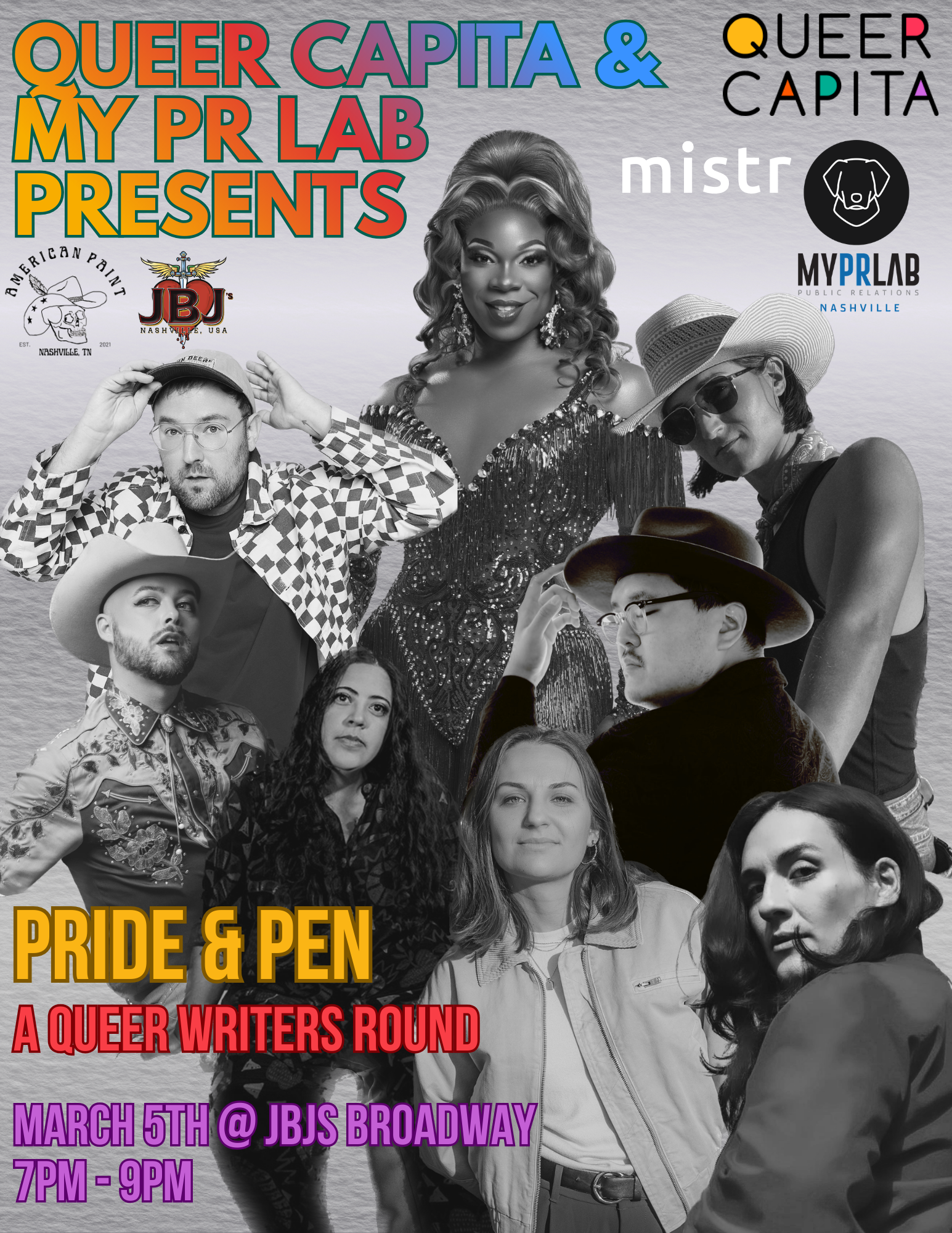 Event Description: Queer Capita X MY PR Lab presents Pride & Pen: A Queer Writers’ Round, an unforgettable nonprofit evening hosted by drag queen Alexia Noelle Paris on the private 4th floor of JBJ’s Nashville, created to celebrate LGBTQAI+ artistry and raise funds to support Queer Capita’s national mission of uplifting queer creatives, executives, and founders across music and entertainment.